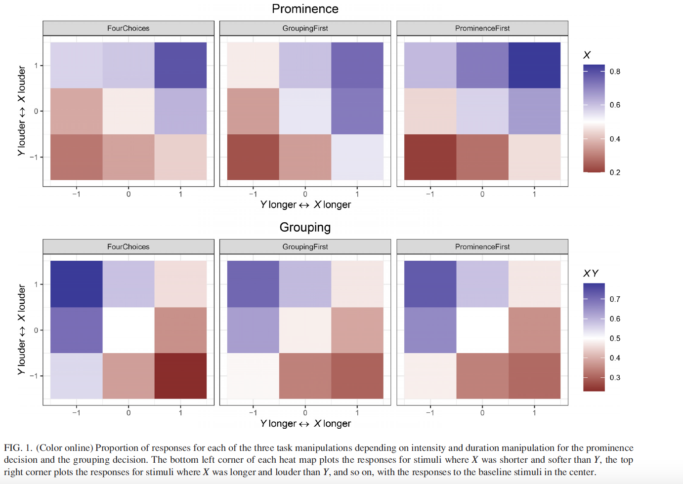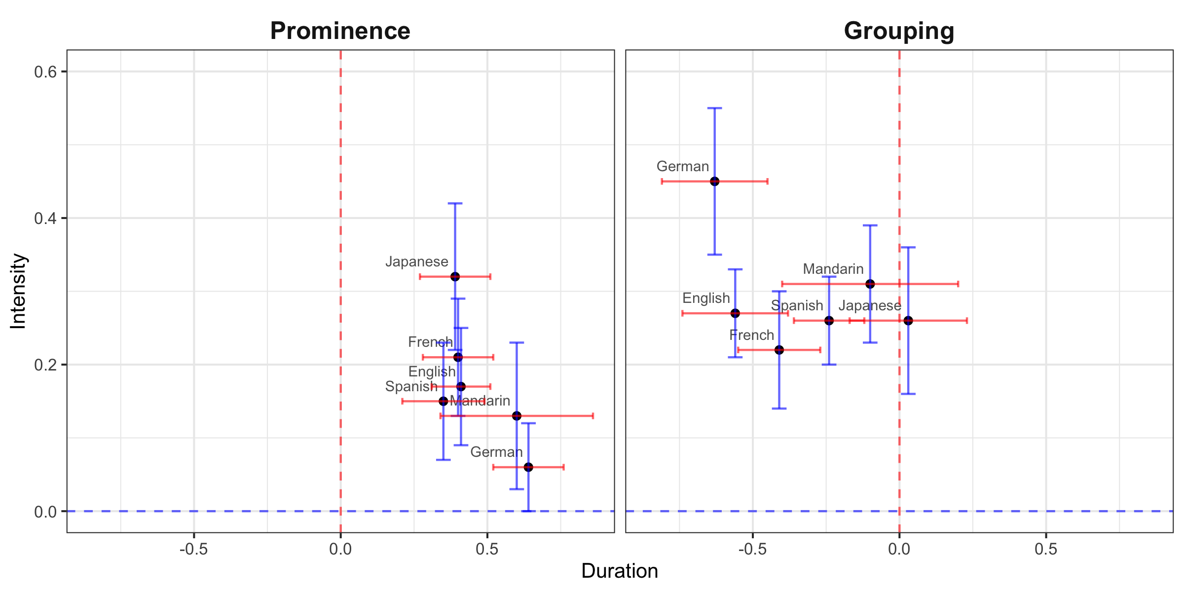 We explore how intensity and duration relate to percepts of prominence and grouping in six languages (English, French, German, Japanese, Mandarin, and Spanish).