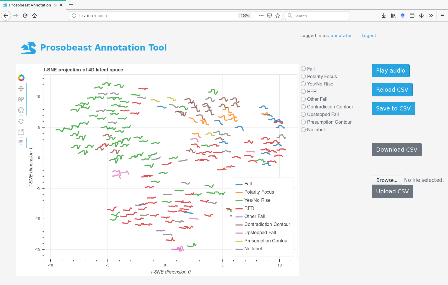 The ProsoBeast Annotation Tool seeks to ease and accelerate this process by providing an interactive 2D representation of the prosodic landscape of the data, in which contours are distributed based on their similarity.